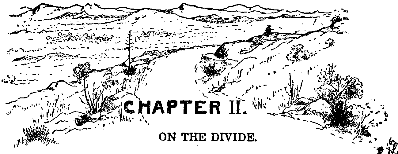 While the stranger sat wrapped in meditative thought, unheeding the approach of the rider, the horseman, coming on with a long, swinging lope, watched the motionless figure on the summit of the Divide with careful interest. As he drew nearer the cowboy pulled his horse down to a walk, and from under his broad hat brim regarded the stranger intently. He was within a few yards of the point where the man sat when the latter caught the sound of the horse's feet, and, with a quick, startled look over his shoulder, sprang up and started as if to escape. But it was too late, and, as though on second thought, he whirled about with a half defiant air to face the intruder.