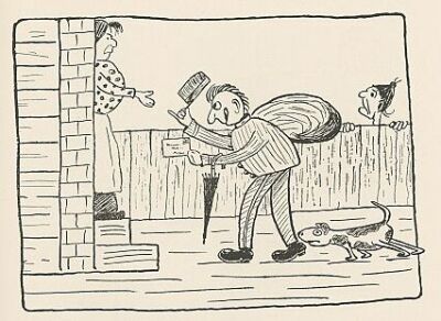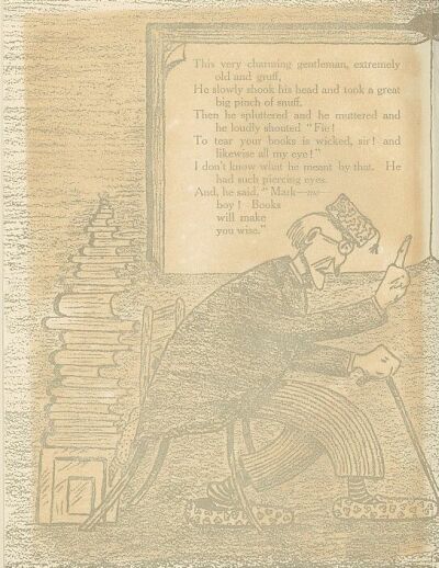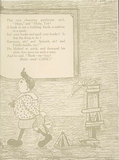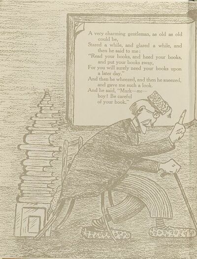 This very charming gentleman, extremely old and gruff, He slowly shook his head and took a great big pinch of snuff, Then he spluttered and he muttered and he loudly shouted "Fie! To tear your books is wicked sir! and likewise all my eye!" I don't know what he meant by that. He had such piercing eyes. And, he said, "Mark--ME--boy! Books will make you wise." This very charming gentleman said, "Hum," and "Hoity, Toit! A book is not a building block, a cushion or a quoit. Soil your books and spoil your books? Is that the thing to do? Gammon, sir! and Spinach, sir! And Fiddle-faddle, too!" He blinked so quick, and thumped his stick, then gave me such a stare. And he said, "Mark--ME--boy! BOOKS--NEED--CARE!"