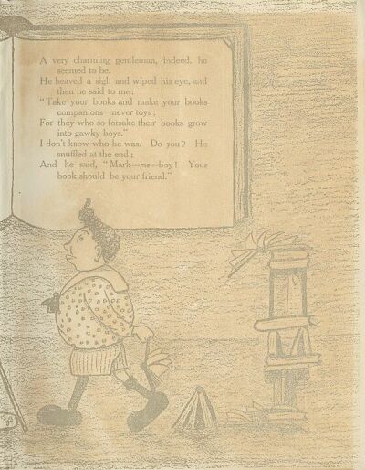A very charming gentleman, as old as old could be, Stared a while, and glared a while, and then he said to me: "Read your books, and heed your books, and put your books away, For you will surely need your books upon a later day." And then he wheezed and then he sneezed, and gave me such a look. And he said, "Mark--ME--boy! Be careful of your book." A very charming gentleman, indeed, he seemed to be. He heaved a sigh and wiped his eye, and then he said to me: "Take your books and make your books companions--never toys; For they who so forsake their books grow into gawky boys." I don't know who he was. Do you? he snuffled at the end; And he said, "Mark--ME--boy! Your book should be your friend."