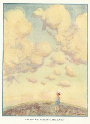 THE BOY WHO RODE INTO THE SUNSET Once upon a time--it was not so very long ago, either--a little boy, named Neville, lived with his people in a house which was almost in the country. That is to say, it was just at the edge of the city; and at the back of the house was a rather large hill, which was quite bald. Neville, who was fond of playing by himself, would often wander to the top of the bald hill; and if he stood right on top of it and looked one way, toward the East, he could see right over the city, with all its tall buildings and domes and spires and smoking chimneys. But looking the other way, to the West, he could see for miles over the beautiful country, with its green fields and orchards and white roads and little farm houses. One evening Neville was playing alone on the top of the hill when he noticed that one of the very finest sunsets he had ever seen was just coming on. The sky in the West, away over the broad country lands, was filled with little clouds of all sorts and shapes, and they were just beginning to take on the most wonderful colours. Neville had often before amused himself with watching clouds and the strange shapes into which they changed themselves--sometimes like great mountain ranges, sometimes like sea-waves, and very often like elephants and lions and seals and all manner of interesting things of that sort. But never before had he been able to make out so many animal shapes in the clouds. The sky was almost as good as a Zoo. There were kangaroos and elephants and a hen with chickens and wallabies and rabbits and a funny man with large ears and all sorts of other peculiar shapes. The sun was sinking behind a distant range of hills, where a golden light shone out as if through a gateway. It was so much like a great golden gateway that Neville fell to wondering what might be found on the other side of it. Suddenly, right in the middle of all the coloured clouds, he saw one little cloud which was perfectly white, and, as he watched it, he noticed that it seemed to be shaped like a small horse. A very small horse it seemed at that distance; but, as Neville gazed, it grew bigger and bigger, just as if it were coming toward him very fast, and he was almost certain he could see its legs moving. That startled him a little, and so he rubbed his eyes to make sure that they were not playing him tricks. When he looked again he was more startled than ever; for the little white cloud was no longer a cloud, but a little white horse in real earnest. Besides, it had just left the sky and was galloping down the mountain range which he could see away in the West. In two minutes it had left the range, and was coming across the fields towards him, jumping the fences, dodging under the trees, and racing across the plain with its white mane and tail tossing as it came. It seemed to be making straight for him. He was not really frightened--you must not think that about him--but he was just beginning to wonder if it were not nearly time to go home to dinner, when he noticed that the white horse had stopped, just at the foot of the bald hill. It was looking up at him, tossing its head and pawing the ground--the most beautiful white horse that he had ever seen, even in a circus. Then it appeared to get over its excitement and began to trot quietly up the hill toward him. I do not think anyone would have blamed Neville if he had decided then to go home to dinner at once. But he was rather a brave boy, and he was certainly very curious, so he just stood still and waited. And here is where the most wonderful part of the story begins. The white horse trotted up to Neville and spoke to him. That would surprise most people; and Neville was certainly as much surprised as anyone else would have been. "What are you frightened of?" asked the white horse in a loud voice. Now, Neville WAS just a little frightened by this time; but he was not going to show it, so he just said, "Who's frightened?" "YOU'RE frightened," said the white horse, louder than ever. "You're only a timid little boy. I thought when I saw you in the distance that you were one of the plucky ones; but I was mistaken. You're just a little cowardly-custard." "You'd better be careful who you're talking to," said Neville, suddenly losing his fear. (Little boys do not always talk good grammar; otherwise he would have said "whom" not "who.") He hated to be called a "cowardly-custard." "You'd better be careful, or I'll give you a bang!" "Ah ha!" cried the white horse. "Very brave all at once, aren't you? All the same, you're afraid to come near and stroke me." "But I don't want to stroke you," said Neville. "I thought not," replied the white horse. "I thought not, the moment I got close to you. You're one of the frightened ones, and I've been wasting my time." "Who's frightened?" said Neville again. "You asked that before," replied the white horse, "and I told you. If you're not frightened, come along and stroke me. There's nothing to be afraid of." So Neville walked right up to the white horse and stroked his shoulder. And at once he felt that he had been foolish to hold back. For of all the smooth, soft, silky coats he had ever stroked, that of the white horse was certainly the smoothest, and the softest, and the silkiest. He felt that he could go on stroking it for hours. "There now," said the white horse in a voice as soft and silky as his coat. "There was nothing to be afraid of, was there? And I think that perhaps I was mistaken about you. I rather think you might be one of those daring boys that one reads about in stories. What about jumping on my back for a little ride?" Neville ceased to stroke the white horse and drew back a little. "I'm afraid they'll be expecting me home for dinner," he said. "I'm very pleased indeed to have met you." Neville was always a polite little boy. "The very thing!" cried the white horse. "Jump on my back and I'll take you home. You liked stroking me, didn't you? Well that's nothing to the ride y
