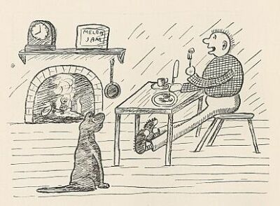 Harry was a funny man, Harry was a hatter; He ate his lunch at breakfast time and said it didn't matter. He made a pot of melon jam and put it on a shelf, For he was fond of sugar things and living by himself. He built a fire of bracken and a blue-gum log, And he sat all night beside it with his big--black--dog.