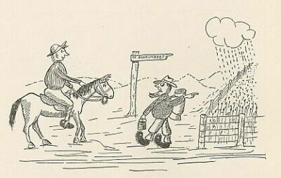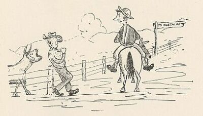 As I rode in to Burrumbeet, I met a man with funny feet; And, when I paused to ask him why His feet were strange, he rolled his eye And said the rain would spoil the wheat; So I rode on to Burrumbeet. As I rode in to Beetaloo, I met a man whose nose was blue; And when I asked him how he got A nose like that, he answered, "What Do bullocks mean when they say 'Moo'?" So I rode on to Beetaloo.