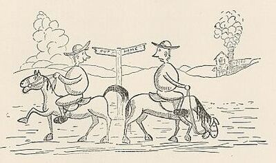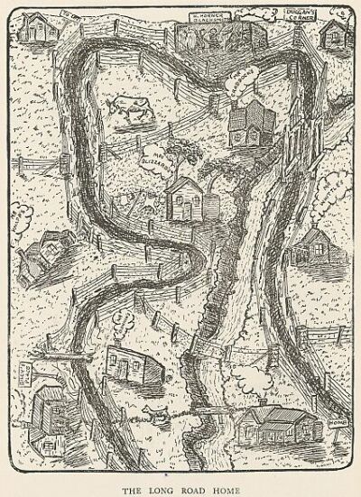 When I go back from Billy's place I always have to roam The mazy road, the crazy road that leads the long way home. Ma always says, "Why don't you come through Mr Donkin's land? The footbridge track will bring you back." Ma doesn't understand. I cannot go that way, you know, because of Donkin's dog; So I set forth and travel north, and cross the fallen log. Last week, when I was coming by, that log had lizards in it; And you can't say I stop to play if I just search a minute. I look around upon the ground and, if there are no lizards, I go right on and reach the turn in front of Mrs Blizzard's. I do not seek to cross the creek, because it's deep and floody, And Ma would be annoyed with me if I came home all muddy. Perhaps I throw a stone or so at Mrs Blizzard's tank, Because it's great when I aim straight to hear the stone go "Plank!" Then west I wend from Blizzard's Bend, and not a moment wait, Except, perhaps, at Mr Knapp's, to swing upon his gate. So up the hill I go, until I reach the little paddock That Mr Jones at present owns and rents to Mr Craddock. For boys my size the sudden rise is quite a heavy pull, And yet I fear a short-cut here because of Craddock's bull; So I just tease the bull till he's as mad as he can get, And then I face the corner place that's been so long to let. It's very well for Ma to tell about my dawdling habits. What would you do, suppose you knew the place was thick with rabbits? I do not stay for half a day, as Ma declares I do. No, not for more than half-an-hour--perhaps an hour--or two. Then down the drop I run, slip-slop, where all the road is slithy. And have to go quite close, you know, to Mr Horner's smithy. A moment I might tarry by the fence to watch them hammer, And, I must say, learn more that way than doing sums and grammar. And, if I do sometimes climb through, I do not mean to linger. Though I did stay awhile the day Bill Homer burst his finger. I just stand there to see the pair bang some hot iron thing And watch Bill Horner swing the sledge and hit the anvil--Bing! (For Mr Horner and his son are great big brawny fellows: Both splendid chaps!) And then, perhaps, they let me blow the bellows. A while I stop beside the shop, and talk to Mr Horner; Then off I run, and race like fun around by Duggan's Corner. It's getting late, and I don't wait beside the creek a minute, Except to stop, maybe, and drop a few old pebbles in it. A few yards more, and here's the store that's kept by Mr Whittle-- And you can't say I waste the day if I 'ust wait. . . a little. One day, you know, a year ago, a man gave me a penny, And Mr Whittle sold me sweets (but not so very many). You never know your luck, and so I look to see what's new In Mr Whittle's window. There's a peppermint or two, Some buttons and tobacco (Mr Whittle calls it "baccy"), And fish in tins, and tape, and pins. . . . And then a voice calls, "Jacky!" "I'm coming, Ma. I've been so far-around by Duggan's Corner. I had to stay awhile to say 'Good day' to Mr Horner. I feel so fagged; I've tramped and dragged through mud and over logs, Ma-- I could not go short-cuts, you know, because of bulls and dogs, Ma. The creek, Ma? Why, it's very high! You don't call that a gutter? Bill Horner chews tobacco, Ma. . . . I'd like some bread and butter."