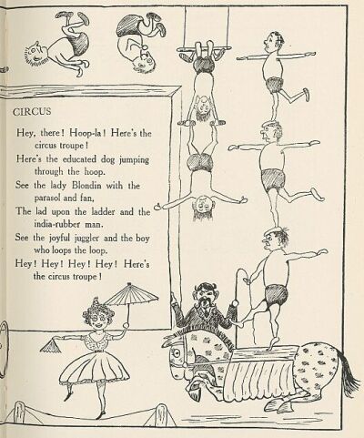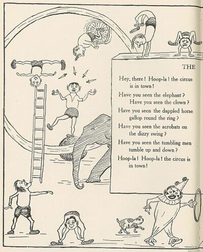 Hey, there! Hoop-la! the circus is in town! Have you seen the elephant? Have you seen the clown? Have you seen the dappled horse gallop round the ring? Have you seen the acrobats on the dizzy swing? Have you seen the tumbling men tumble up and down? Hoop-la! Hoop-la! the circus is in town! Hey, there! Hoop-la! Here's the circus troupe! Here's the educated dog, jumping through the hoop. See the lady Blondin with the parasol and fan, The lad upon the ladder and the india-rubber man. See the joyful juggler and the boy who loops the loop. Hey! Hey! Hey! Hey! Here's the circus troupe!