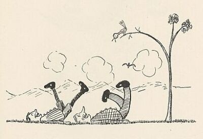 The earth is quite a jolly place, And we don't care for flying; And thnigs that creep down in the deep Are sometimes rather trying. So, if they'll grant a holiday Or even only half, We'll lie upon some grassy place, And think of things, and laugh.