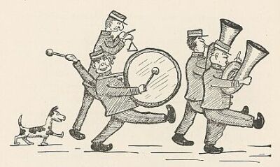 Hey, there! Listen awhile! Listen awhile, and come. Down in the street there are marching feet, and I hear the beat of a drum. Bim! Boom!! Out of the room! Pick up your hat and fly! Isn't it grand? The band! The band! The band is marching by! Oh, the clarinet is the finest yet, and the uniforms are gay. Tah, rah! We don't go home-- Oom, pah! We won't go home-- Oh, we shan't go home, and we can't go home when the band begins to play.