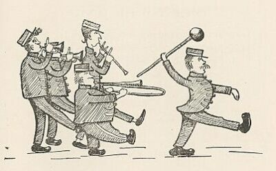 Oh, see them swinging along, swinging along the street! Left, right! buttons so bright, jackets and caps so neat. Ho, the Fire Brigade, or a dress parade of the Soldier-men is grand; But everyone, for regular fun, wants a Big-Brass-Band. The slide-trombone is a joy alone, and the drummer! He's a treat! So, Rackety-rumph! We don't go home-- Boom, Bumph! We won't go home-- Oh, we shan't go home, and we can't go home while the band is in the street. Tooral-ooral, Oom-pah! The band is in the street!