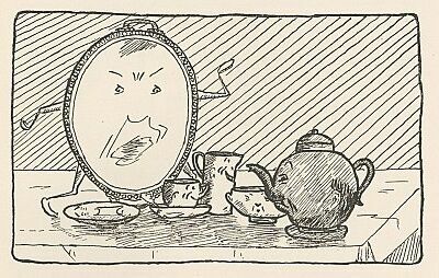 'Excuse me if I sit on you,' the cup said to the saucer. 'I fear I've been here all the afternoon.' 'Spare excuses,' said the saucer; 'you have sat on me before, sir.' 'Oh, I'll stir him up directly,' said the spoon. 'Stop your clatter! Stop your clatter!' cried the bread-and-butter platter 'Tittle-tattle!' sneered the tea-pot, with a shrug; 'Now, the most important question is my chronic indigestion.' 'Ah, you've taken too much tannin,' jeered the jug. 'Hey, hey, hey!' sang the silver-plated tray, 'It's time you had your faces washed. I've come to clear away!'