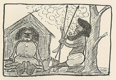 Old Black Jacko Smokes tobacco In his little pipe of clay. Puff, puff, puff, He never has enough Though he smokes it all day. But his lubra says, "Mine tink dat Jacky Him shmoke plenty too much baccy."