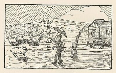 UPON THE ROAD TO ROCKABOUT Upon the road to Rockabout I came upon some sheep-- A large and woolly flock about As wide as it was deep. I was about to turn about To ask the man to tell Some things I wished to learn about Both sheep and wool as well, When I beheld a rouseabout Who lay upon his back Beside a little house about A furlong from the track. I had a lot to talk about, And said to him "Good day." But he got up to walk about, And so I went away--