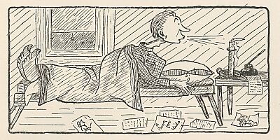 THE PUBLISHER I'd like to be a publisher, And publish massive tomes Written in a massive style by blokes with massive domes-- Science books, and histories of Egypt's day and Rome's, Books of psycho-surgery to mine the minds of momes, And solemn pseudo-psychic stuff to tell where Topsy roams When her poor clay is put away beneath the spreading holms; Books about electrocuting little seeds with ohms To sternly show them how to grow in sands, and clays, and loams, And bravely burst infinitives, like angry agronomes; Books on breeding aeroplanes and airing aerodromes, On bees that buzz in bonnets and the kind that build the combs, Made plain with pretty pictures done in crimsons, mauves, and chromes; And diagrams to baulk the brain of Mr. Sherlock Holmes. I'd set the scientists to work like superheated gnomes, And make them write and write and write until the printer foams And lino men, made "loony", go to psychopathic homes. I'd publish books, I would--large books on ants and antinomes And palimpsests and palinodes and pallid pallindromes: But I wouldn't be a publisher if . . . . I got many "pomes." Would you?