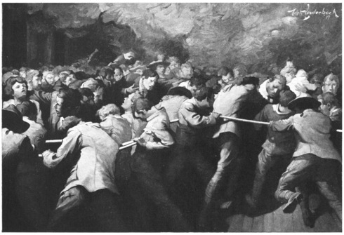 Down swung the staves, interlocking in a double barrier of stout hickory backed by equally sturdy muscle. The scoutmaster had barely time to place himself at the apex of the wedge before the mob struck it.
