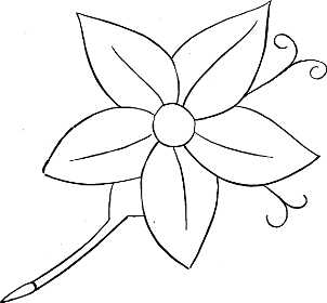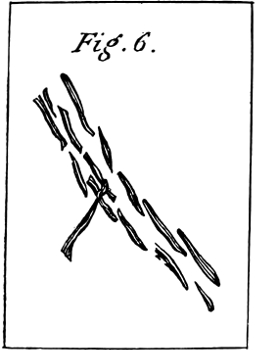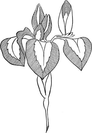 In working the stalk of a flower, it is better to begin at the lower end first, and work on the outline until it is crossed by a leaf or terminates in a flower; then pass the needle to the other side, and work back again to the lower end; then work another line of stitches inside the outline till the stalk is filled up. See Figure 6. Leaves of one shade are done in the same way, and the veins are put in last.