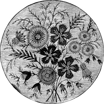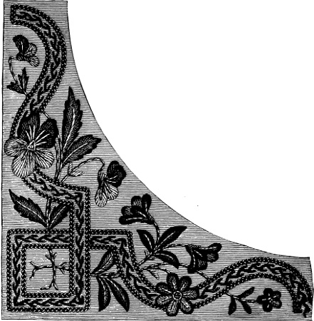 It has been well said that needlework should be in every way adapted to the material used. As the sculptor’s chisel and the painter’s[iv] brush have each their separate function and domain, so has the needle of the embroideress; nor should anything lying beyond its proper powers be attempted by its means. Flowers and foliage being the decorative part of nature, we instinctively choose them to represent in needlework. The grand productions of ancient tapestry, containing whole histories of wars and sieges, are never likely to be repeated in our days, in which leisure and industry are both lacking; and we must content ourselves, at least for the moment, with speaking of the lighter works which lie within the ordinary compass of time and patience.