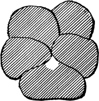 In ordinary crewel-work, the stitch should be from three-eighths to half an inch long, according to its position—some stitches must necessarily be shorter—as in filling in, they must dovetail into each other like the tiles of a roof, that no sharp line of color may indicate the different shades. To produce the desired effect, all the stitches should not be taken close[8] up to the inner edge of color. Figures 3 and 4 will give some idea of this shading.