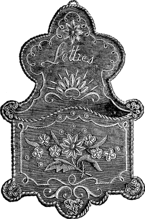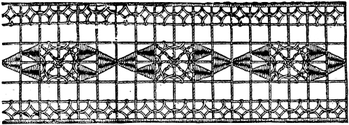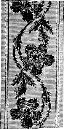 We saw a honeysuckle screen lately, that might have been beautiful, but was not because it had altogether too sombre an air to be viewed in the light of an ornament. The workmanship was fine, and regularly done according to the rules of art, but as the ground was black and the coral honeysuckle was represented in very dull reds and greens, the effect was not enlivening. A gray ground of a silver tinge would have been a great improvement, but dark work on a dark ground is a dismal production.