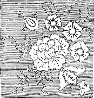 Shaded embroidery should be guided by the same rules that apply to water-color painting, except that greater depth and brilliancy, and consequently less delicacy, are the results in view. It requires much discrimination to give a natural hue to leaves, and, at the same time, to produce such contrasts as will give the proper relief. Portions of each should be much lighter than others; and in the grouping, a mass should be thrown into shadow under the bright leaves—the shadow being composed of dark green mixed with neutral tint.