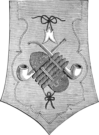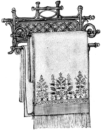 Velveteen makes a good background for crewel embroidery; and this is suitable both for footstools and hangings. It is also handsome for mantel lambrequins. But the favorite material is crash towelling—which is so generally used for the purpose that crewels seem inseparable from it, and the work is quite as often called “crash-work” as crewel-work. Crash is very serviceable for tidies, toilet covers, toilet mats, travelling bags, etc.; but it does not hang in graceful folds for curtains and portières, and it is not worthy of being embroidered in silks.