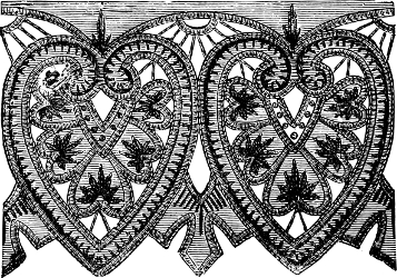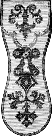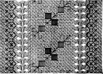 was the favorite needlework of those days; and these hangings, or “veils,” were rendered necessary by the style of building, which afforded many convenient chinks and loopholes for the wind. Some of these ancient pieces of embroidery were very rich, the designs being worked with worsted or silk of various colors, and often mixed with gold or silver threads, on canvas, cloth, or silk.