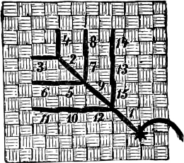 This method of working is to be used when the material is put in a frame; but when the work is done in the hand, it is best illustrated by Figure 2. The easiest and quickest way in this case is to begin at the bottom and work upward—putting the needle through (from the back) at 1, and back again at 2—through again at 3, and back at 4—until the entire distance has been traversed.