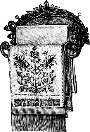 of fine crash, ornamented with crewel-work, are handsome and serviceable for warm weather. A bordering of strawberries and leaves near the edge, or one of periwinkle with its delicate blue flowers, would be very pretty; and this bordering, with a large monogram in the centre, would sufficiently ornament the article.