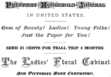 Devoted to Household Elegancies, Housekeeping, Art, Music, Home Pets, Ladies’ Fancy Work, Society, Amusements, Flowers, Window Gardening, Cottages, etc. The Prettiest Ladies’ Paper in America, Beautifully Illustrated. A perfect Gem. Full of good sense, and invaluable to every lady for its refinement, elegance, and rare value.