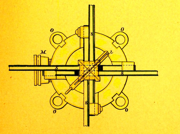 This torpedo, intended for use from either ships or boats, is 12⅜ inches long and 9 inches square, inside measurement, and is made of sheet iron tinned inside and out, coated inside with shellac and painted outside with asphaltum. Around a filling hole in the top is [Pg 2] soldered a brass ring having on its inner circumference, a screw-thread for a brass screw-cover which bears a stuffing-box for the entrance of the spar leading-wires. A rubber washer between the cover and ring makes the case water-tight. Riveted to the top is a tinned malleable iron frame fitted with four lugs. A handle secured to two of the lugs forms a brace for the spindle that attaches the torpedo to the secondary spar; this spindle has two curved arms at one end that straddle the handle and secure to the other two lugs by screw-bolts, a projection on the crown of the handle fitting into a recess in the stem of the spindle. To the bottom of the case is riveted a tinned malleable iron plate for attaching a circuit-closer.