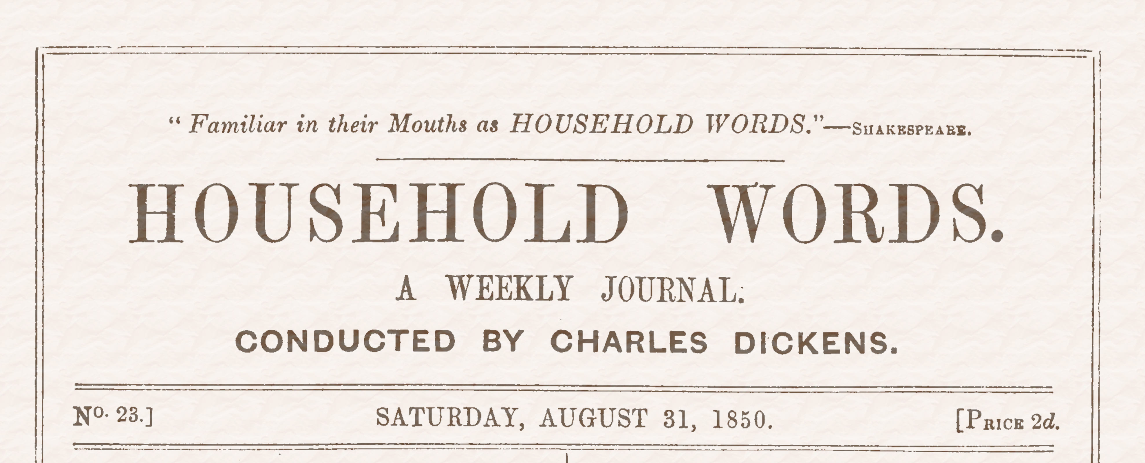 Down at Dartford in Kent, on a fine bright day, I strolled through the pleasant green lanes, on my way to a Paper-Mill. Accustomed, mainly, to associate Dartford with Gunpowder Mills, and formidable tin canisters, illustrated in copper-plate, with the outpourings of a generous cornucopia of dead game, I found it pleasant to think, on a summer morning when all living creatures were enjoying life, that it was only paper in my mind—not powder.