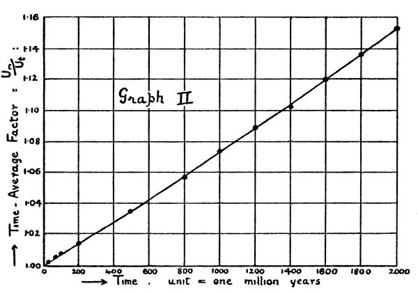In Graph II the ratio Uₘ/Uₜ, i.e. the factor by which the present uranium content of a mineral must be multiplied in order to obtain the true time-average, is plotted against time.