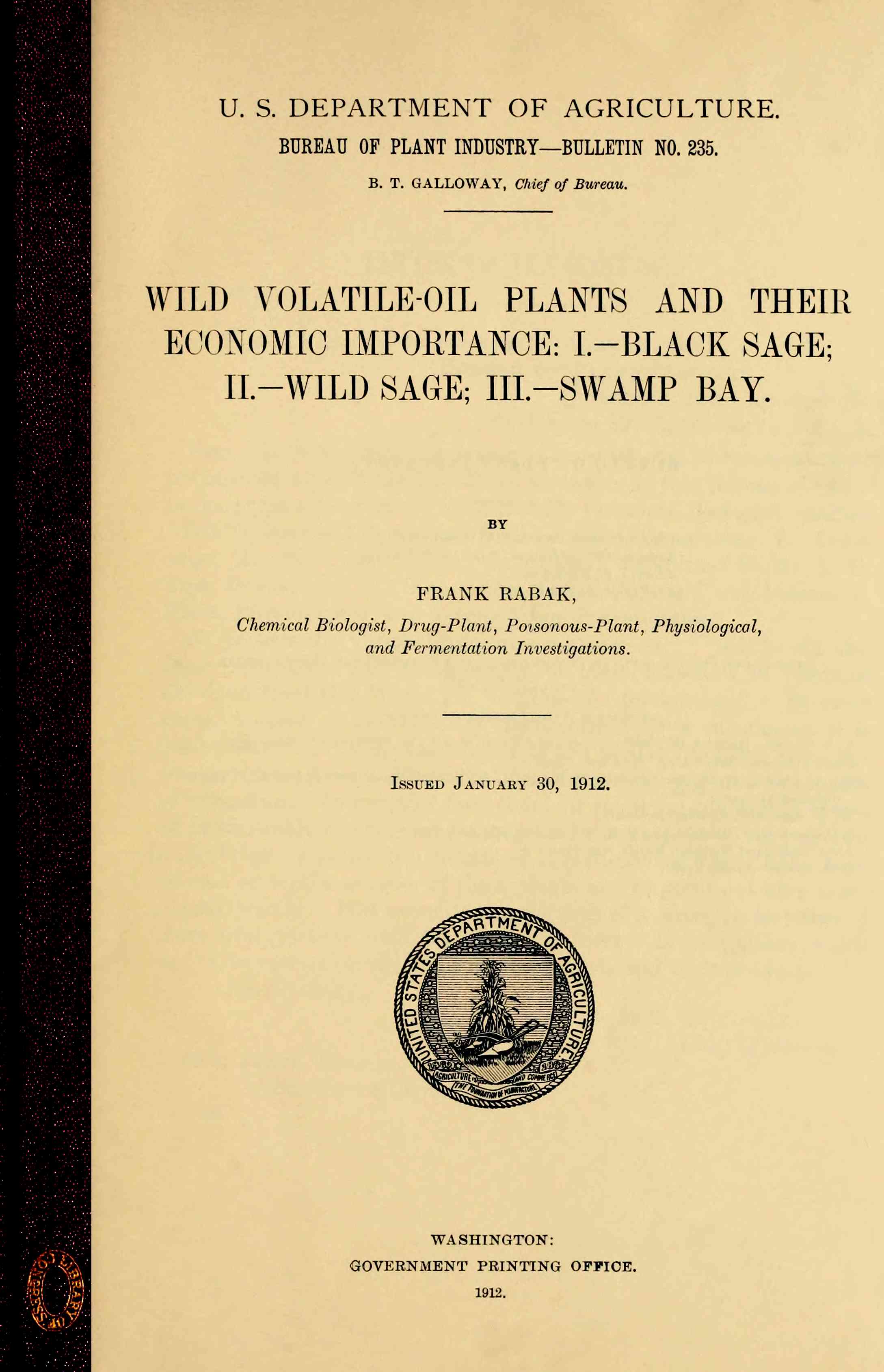 Sir: I have the honor to transmit herewith and to recommend for publication as Bulletin No. 235 of the series of this Bureau a manuscript prepared by Mr. Frank Rabak, Chemical Biologist, entitled “Wild Volatile-Oil Plants and Their Economic Importance: I.—Black Sage; II.—Wild Sage; III.—Swamp Bay,” submitted by Dr. R. H. True, Physiologist in Charge of the Office of Drug-Plant, Poisonous-Plant, Physiological, and Fermentation Investigations.