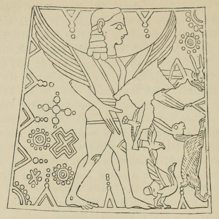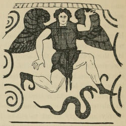[1589] Philosophoum. V. 3 ed. Cruice, ἔστι δ’ ἐν τοῖς πυλεῶσι καὶ πρεσβύτης τις ἐγγεγραμμένος, πολιὸς, πτερωτὸς, γυναῖκα ἀποφεύγουσαν διώκων κυανοειδῆ (κυνοειδῆ the MS.: but Schneidewin’s correction is generally admitted), ἐπιγέγραπται δὲ ἐπὶ τοῦ πρεσβύτου· φάος ῥυέντης, ἐπὶ δὲ τῆς γυναικός· περεηφικόλα. ἔοικε δὲ εἶναι κατὰ τὸν Σηθιανῶν λόγον ὁ φάος ῥυέντης τὸ φῶς, τὸ δὲ σκοτεινὸν ὕδωρ ἡ φικόλα, τὸ δὲ ἐν μέσῳ τούτων διάστημα ἁρμονία πνεύματος μεταξὺ τεταγμένου.
