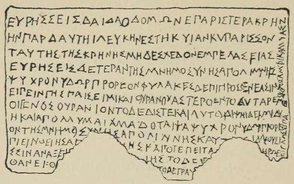 | The tablets our chief source for Orphic doctrines. Their provenance and general character. The Petelia tablet of the British Museum. Analogous tablets from Crete. The Well of Mnemosyne. Parallels in Fiji and Egypt. Lethe in Greek Literature. Lethe in the ritual of Trophonios. The river of Eunoë, Good Consciousness, in Dante. The Sybaris tablets. The tablet of Caecilia Secundina. The confession of Ritual Acts on the Sybaris tablets. The attainment of divinity through purification. The escape from the Wheel. The kid and the milk. The formulary of adoption. Eschatology on Orphic vases from Lower Italy. Orpheus in Hades. The tortured criminals. Developement by Orphism of doctrine of eternal punishment. The Danaides and the Uninitiated, | pp. 573-624. | |