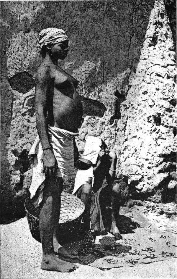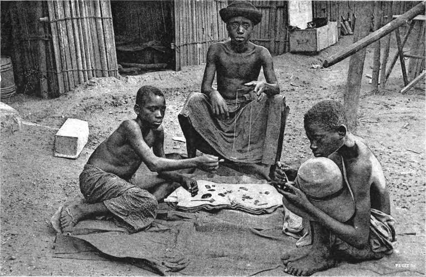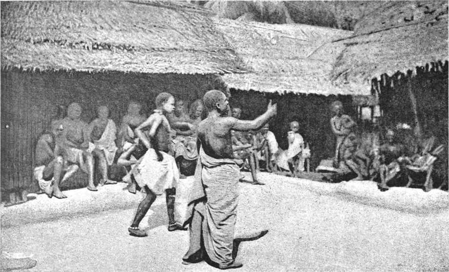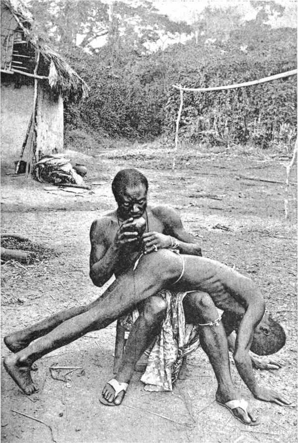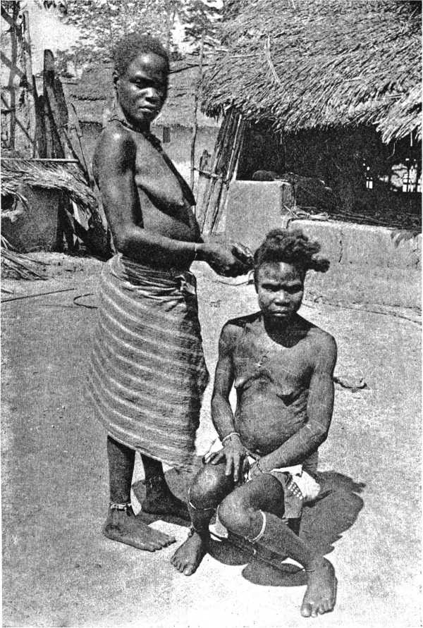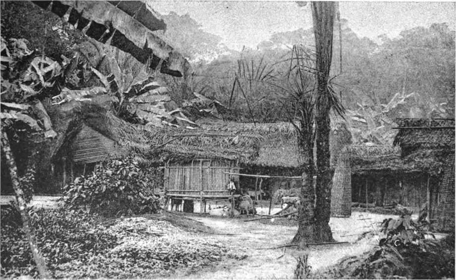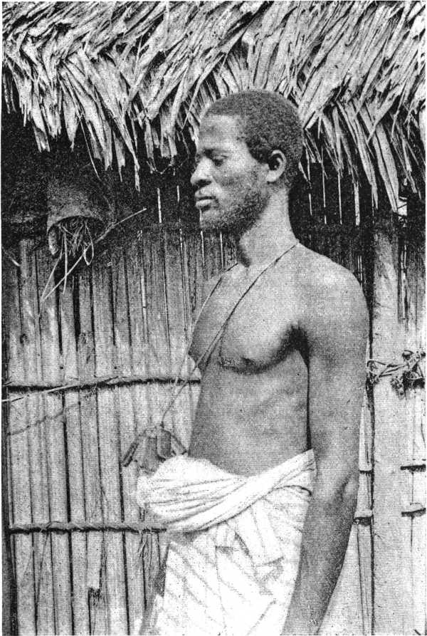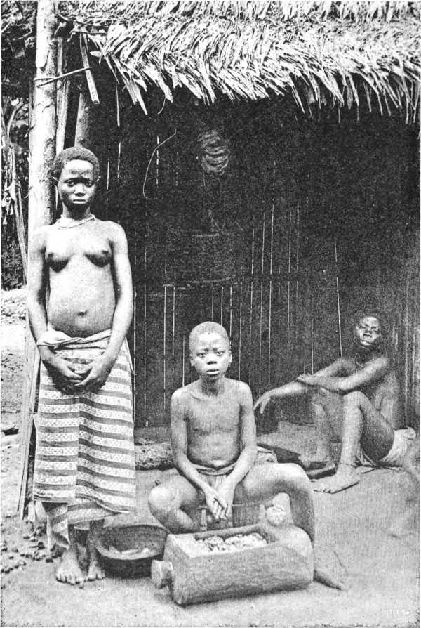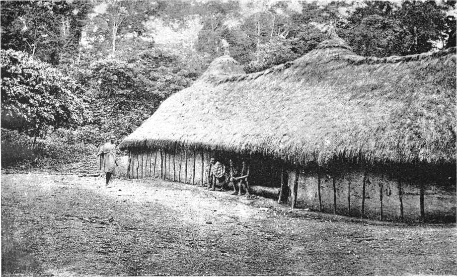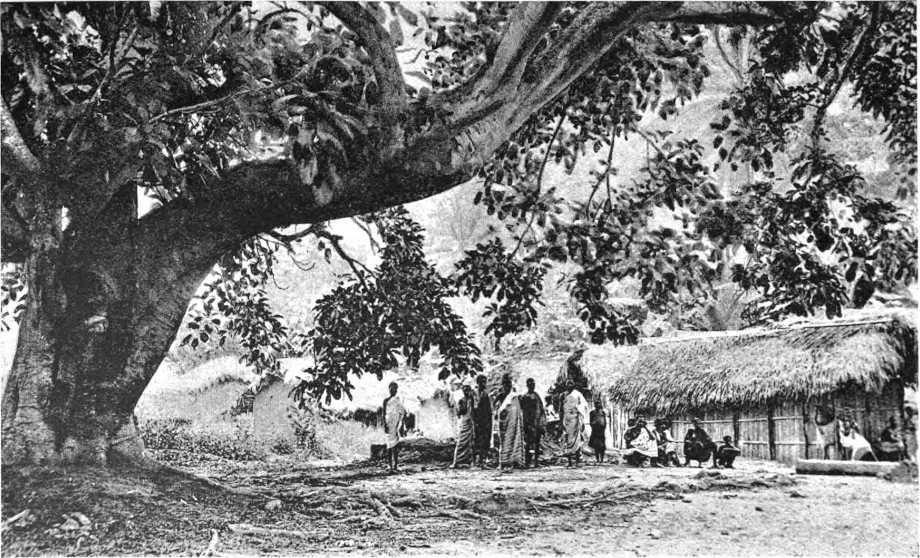 Et le gîte ! En pleine brousse, au flanc d’un coteau, d’un de ces soulèvements volcaniques, reliefs décevants[VIII] escaladés d’un pas rageur, avec l’espérance jamais réalisée de découvrir enfin, de la cime, une échappée sur l’horizon ; un défrichement sommaire, quelques arbres jetés bas et, parmi les décombres de ces colosses, au milieu des bananiers et des maniocs poussant entre les souches calcinées, trois ou quatre petites cases au chaume dévasté, branlantes, dévalant de guingois sur une pente de quarante-cinq degrés. Çà et là, occupées à laver, pour le compte d’un chef, le quartz aurifère, quelques femmes, s’il est permis d’appliquer ce nom aux silhouettes fantomatiques des captives évoluant autour de nous dans la pénombre. Elles vivaient là, ces créatures, seules, entre la forêt ruisselante et le marigot aux eaux troubles, décharnées, un lambeau de pagne aux reins, hideuses sous la carapace de vase qui s’écaillait sur leurs membres grêles. Quelles hôtesses !